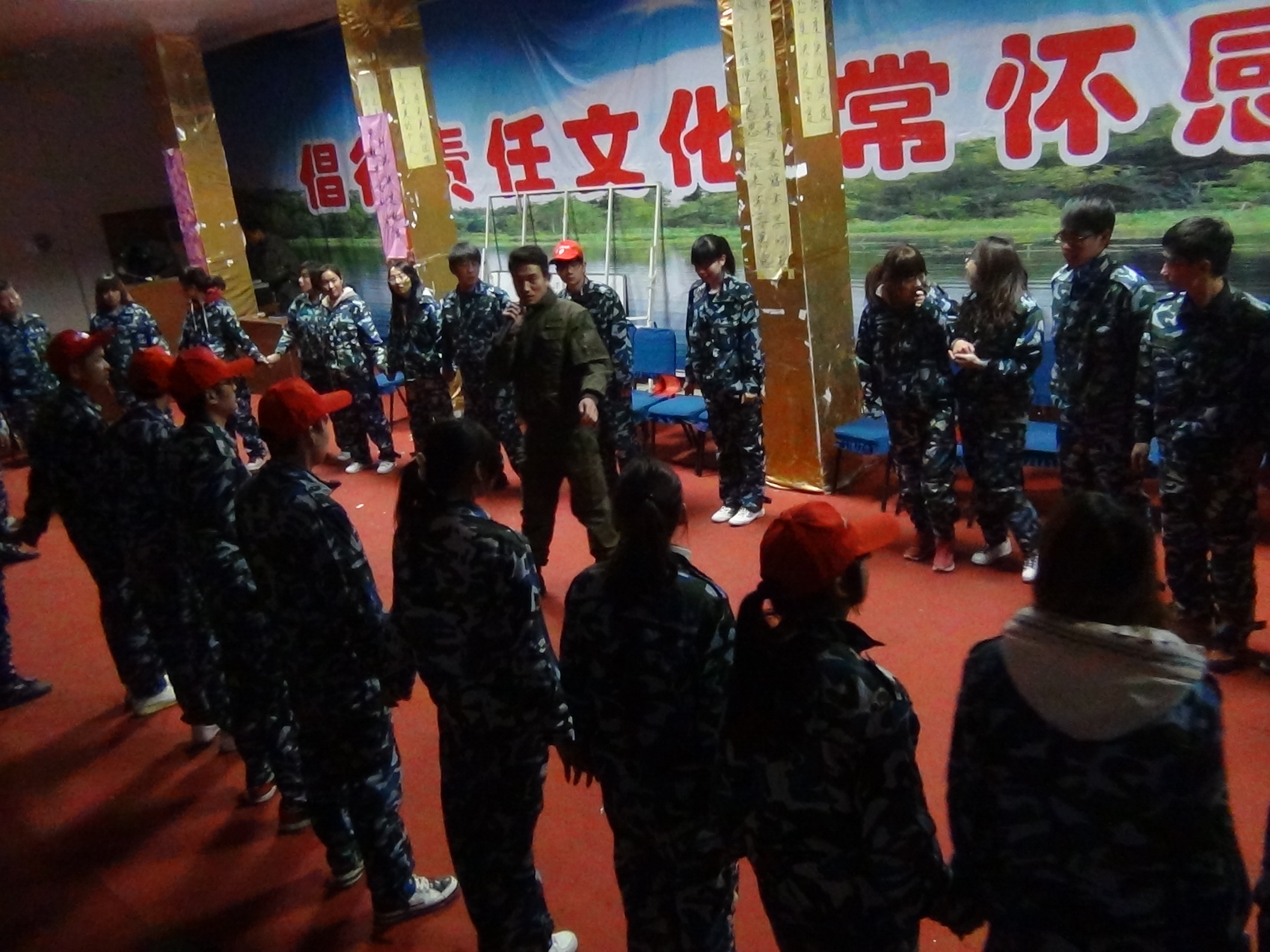 我们的团队对抗赛,大家都握着队友的手大声的呼喊‘加油"
